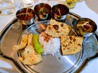 Chef\'s daily appetizer for two, two meat-based mains, one vegetarian main, basmati rice, and two plain naans.